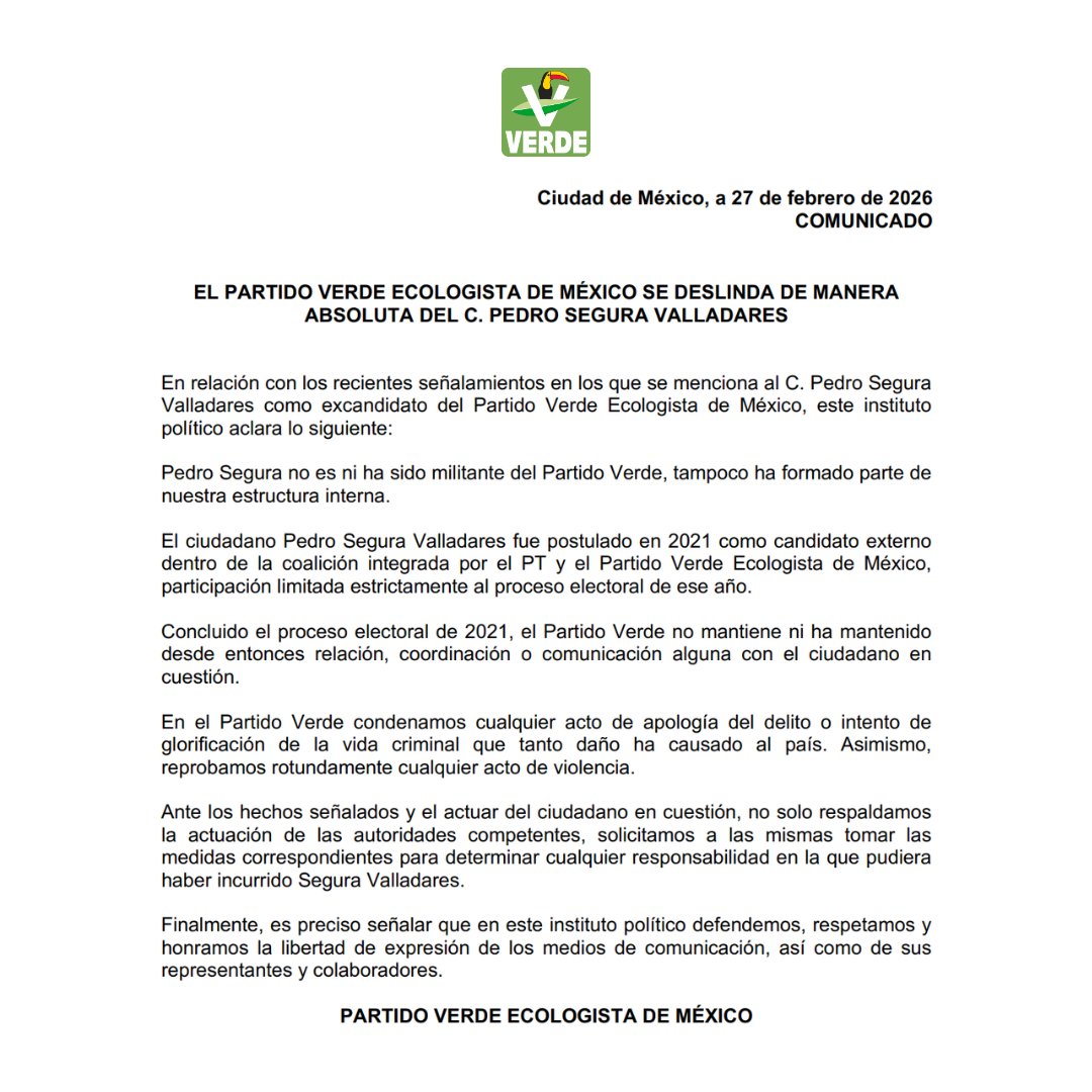 ¡Qué sofocón se armó en las filas del «Tucán»! Resulta que el Partido Verde Ecologista de México (PVEM) ya no quiere saber ni el nombre de Pedro Segura Valladares, aquel personaje que en 2021 buscó la gubernatura de Guerrero. A través de un comunicado con fecha de este 27 de febrero de 2026, el instituto político puso pies en polvorosa y dejó claro que el empresario no tiene vela en ese entierro, ni militancia, ni hueso dentro de su estructura interna.