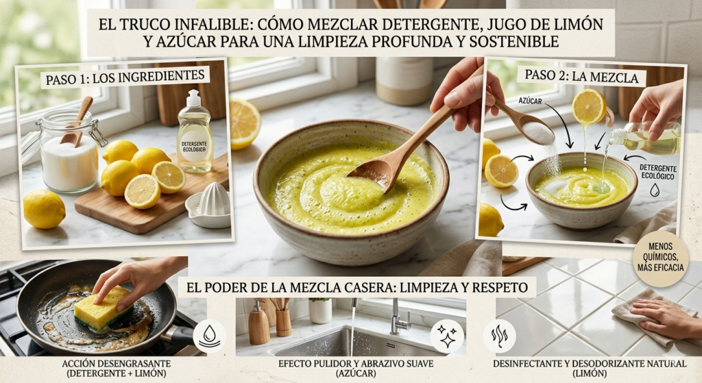 En medio del creciente interés por alternativas más naturales y menos agresivas para el hogar, una mezcla sencilla de detergente, jugo de limón y azúcar se ha convertido en uno de los trucos de limpieza más populares. Esta combinación, destacada por portales especializados como The Spruce y Good Housekeeping, aprovecha las propiedades específicas de cada ingrediente para ofrecer resultados eficaces en la eliminación de suciedad persistente.